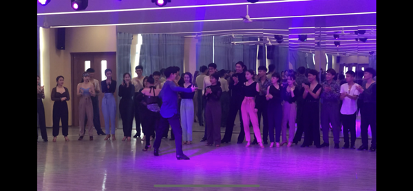 郑洋老师现场展示了恰恰恰、桑巴的Basic、舞蹈风格、音乐切分舞蹈技艺,并分享了多年来在英国黑池舞蹈节、南京、天津等地教学经验。比如,在每一次训练之前事先树立好训练的目标,训练时抛开杂念,静下心来反复练习基本步、双人舞技术,这样能更快获得进步和成长。他希望同学们在拉丁舞表现中糅合芭蕾、现代舞等多种元素,将舞蹈艺术表现变得丰富起来。