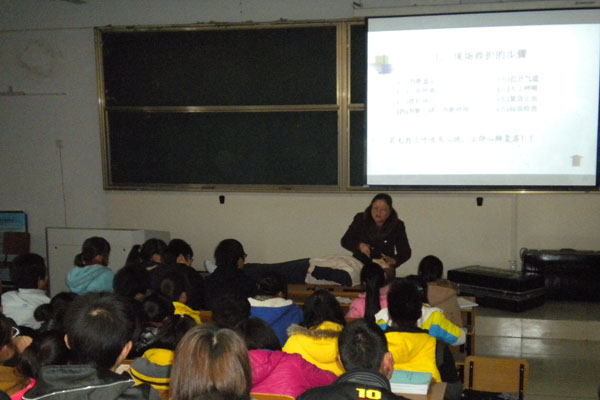 章峥嵘首先简要介绍了国际红十字会和中国红十字会的发展历程,详细讲解了实施救助的安全风险评估、病情判断、自救互救的操作程序与注意事项,认真演示了心肺复苏的操作方法、注意事项和终止条件。同时章老师还结合大学生可能遇到的溺水、运动损伤、意外创伤、火灾等意外事故如何开展自救互救作了一一讲解。