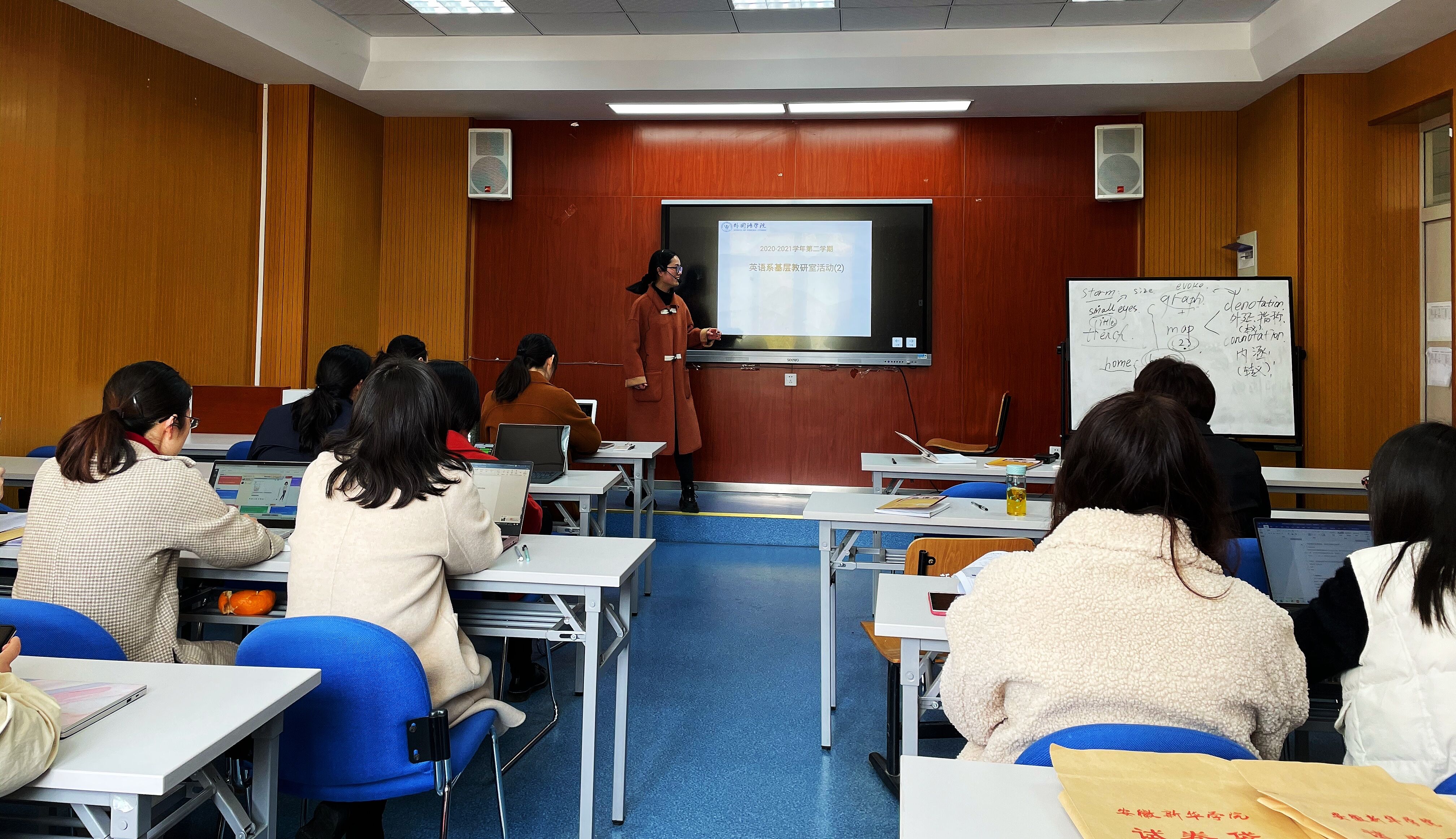 首先,张曼丽老师进行了《专业综合素质实训(1)》课程的试讲,对英语专业专四考试的考试流程、题型、分值等方面进行了全面解。通过20分钟的试讲,老师们了解了其授课思路、课程内容的安排及对于教学的思考。随后,佘月月老师和吴晓群老师分别结合实际教学经验分别在开展真题分析、技巧训练和网络资源利用等方面对新教师提出了部分建议。