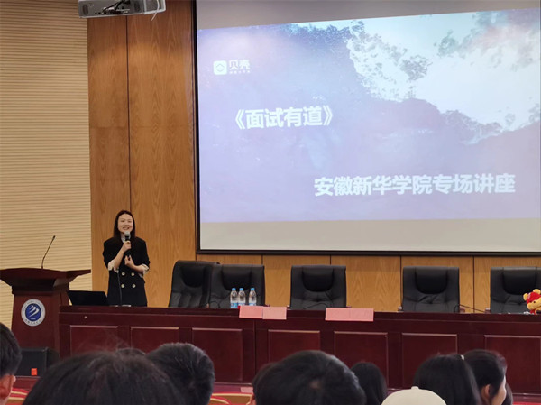 本次讲座由贝壳找房-集团金牌讲师丁月女士作为主讲。主讲人通过《爱丽丝漫游奇境记》中一段话将讲座引入主题,接下来的游戏环节,激发了在座所有学生的兴趣。讲座主要谈及面试的四个主题,即“面试的前提准备”“面试中的注意事项”“面试常见的形式”和“面试结束的注意事项”。丁月女士通过实例,为参加讲座的大学生讲解面试官会如何判断面试者的潜质,所举实例契合当前大学生面试时的真实情况、贴合当前大学生面试需求。接着,丁月女士通过表演形式,向参会大学生展示一位合格的面试者在面试过程中应如何适当地表现自我。丁月女士将关于面试的种类、面试形式等干货分享给各位参会大学生,以丰富大学生们日后参加面试的理论基础。根据讲座主题,讲师丁月女士循序渐进、逻辑清晰,讲座生动形象,与学生进行紧密的交流积极互动,现场氛围高涨。