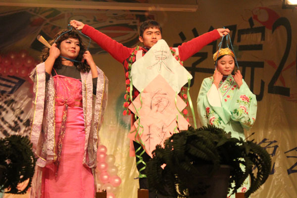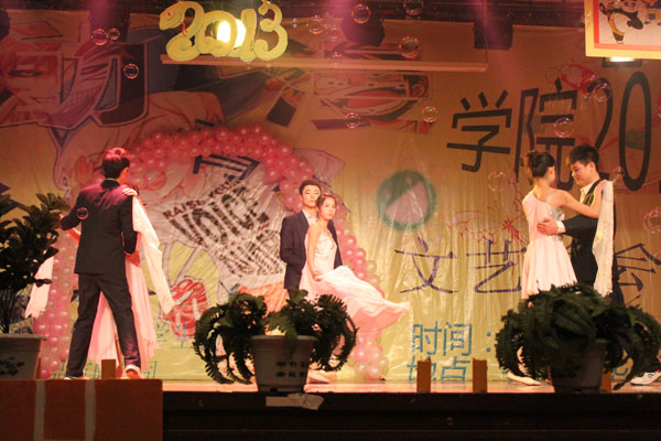话剧《孔雀东南飞》也是本场晚会的一大亮点,这个完全由动漫学院2012级新生自导自演的节目,在男女主人公一出场就赢得了观众的掌声。话剧改编自中国著名的爱情悲剧《孔雀东南飞》,但是演员们创意的将悲剧改为喜剧来描述,也别有一番意味。同时,男女主人公采用反串的形式将刘兰芝与焦仲卿这对恩爱夫妇演绎的极为到位,在节目结束后,欢呼声与掌声久久不息。由动漫学院辅导员崔风波以及李薇薇老师带来的情歌对唱《因为爱情》,则以其温暖的旋律、默契的搭档感染了在场的每一个人,大家不禁都跟着轻声哼唱。最后,晚会在经典的动漫歌曲大串烧中缓缓落下帷幕。