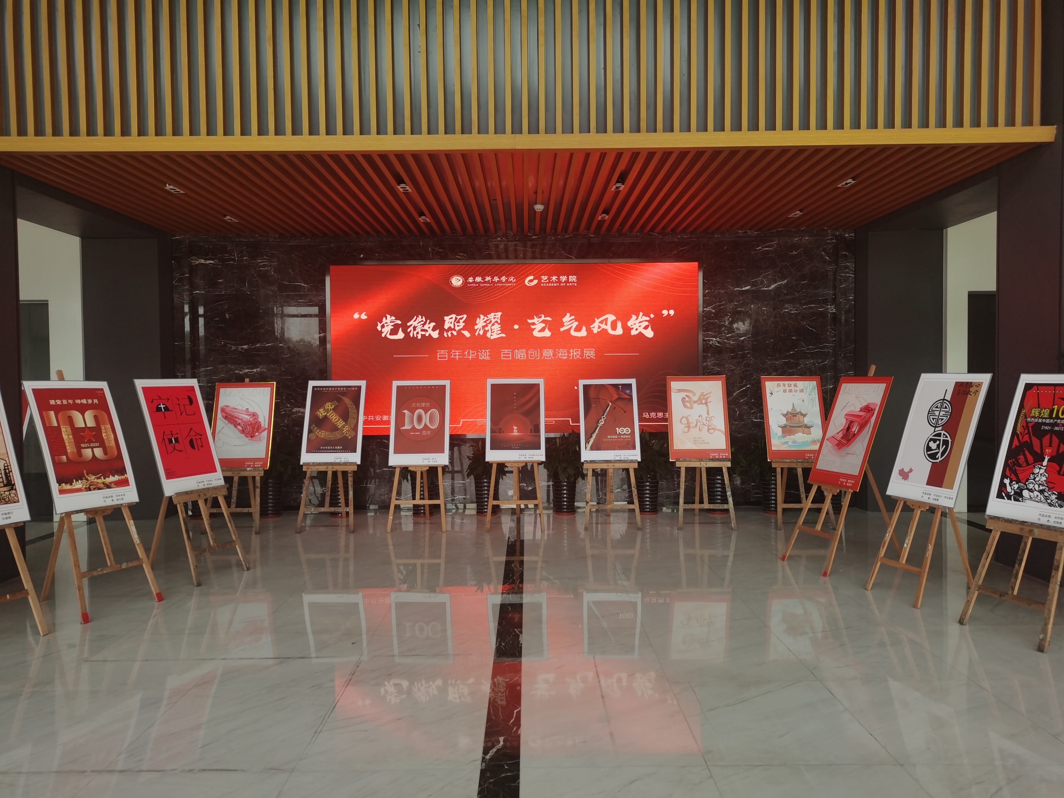 本次活动是由艺术学院党员依据建党100周年的艰辛历程创作的创意海报。从3月开始,艺术学院全体学生党员自愿报名,组成创作小组,搜集建党100周年经典史实资料,以大会策划,小组讨论等多种形式集思广益、头脑风暴,创作出150多幅作品,通过专业老师团队的遴选,最后挑选出100幅进行重点修改和再创作,最后装裱,目前已进行第一次展览,后面将陆续在校园内向全校师生展示。