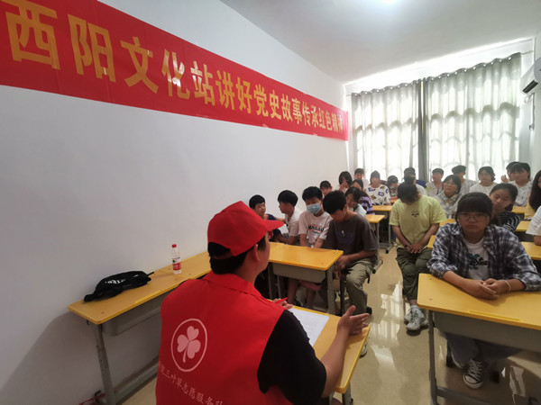 本网讯(通讯员:金保忠)为激发学生爱党爱国情怀,引导学生了解中国共产党光辉的奋斗历程,传承红色精神,7月9日,商学院“三叶草”乡村振兴志愿服务团队结合西阳镇文化站开展“讲好党史故事,传承红色精神”党史宣讲活动。