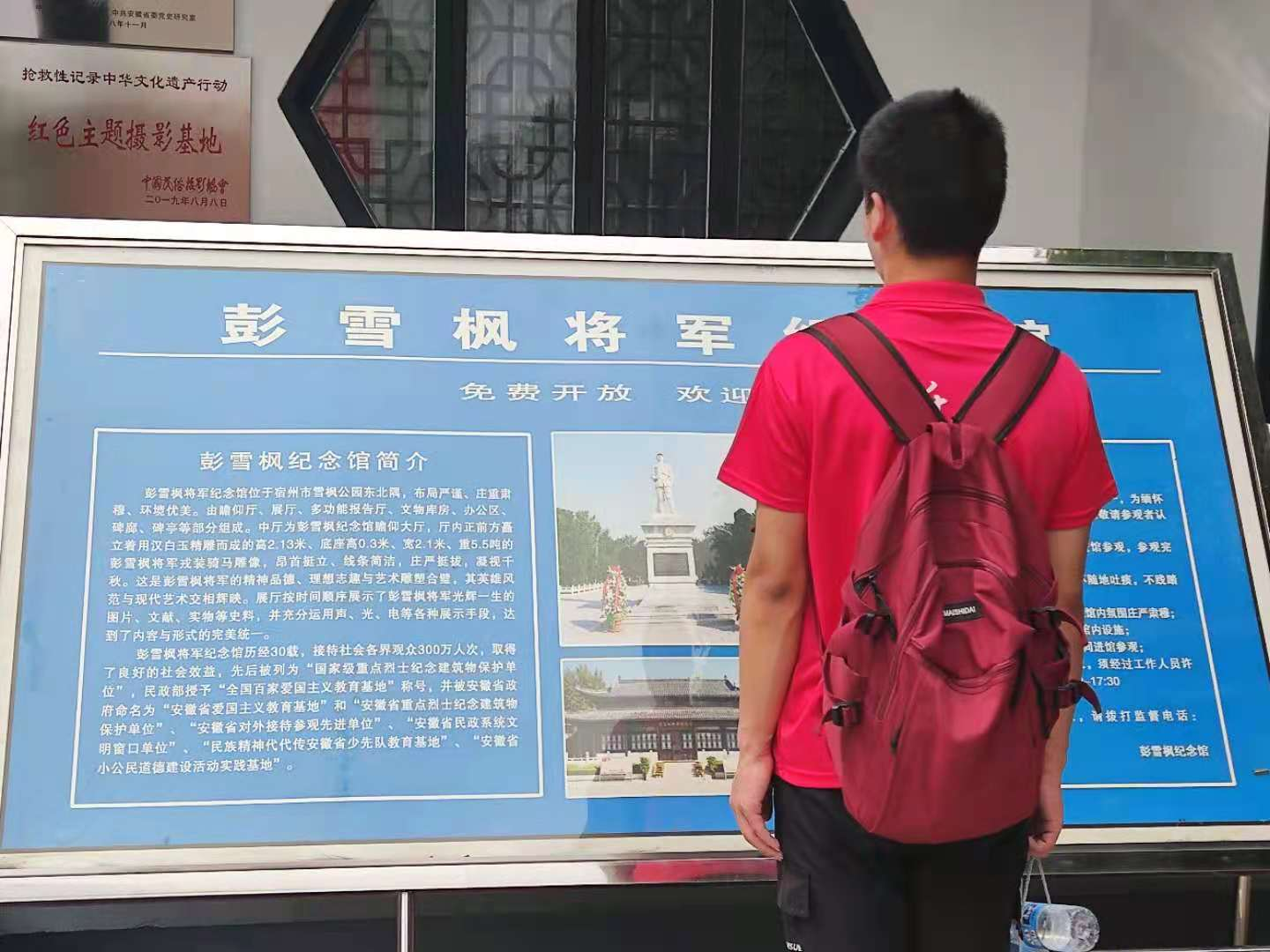宿州大地是彭雪枫将军生前浴血奋战的地方。在这片热土上,他纵横驰骋,指挥若定,组建了坑日游击队,创建了皖东北抗日根据地。为了能够更好的了解彭雪枫将军的英雄事迹,社会实践团队来到了雪枫公园。并且参观了彭雪枫将军纪念馆和淮河战役解放宿县纪念厅。