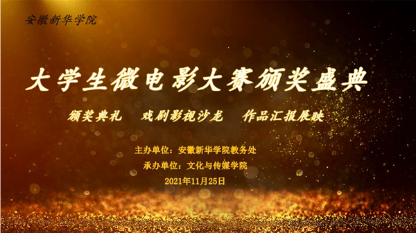 本网讯(通讯员:杨孝艳)为激发相关专业学生的创新能力和实践能力,进一步丰富校园文化生活,弘扬中华美育精神,“以美育美,以美化人,以美培元”,把美育纳入到人才培养的全部过程中,培育新时代创新性技能型人才。11月25日晚,伟德官网2021年大学生微电影大赛颁奖盛典在文传演播厅举行。文化与传媒学院副院长洪玉,教务处处长助理李长凯,文化与传媒学院艺术表演系副主任潘驰群,艺术表演系主任助理郑帅,艺术表演系教师代表许诺、汪婉卓、胡倩和广播电视编导专业全体学生参加此次典礼。本次盛典由文化与传媒学院播音与主持艺术专业的范勇和张欢欢主持。