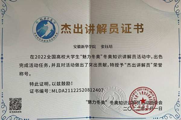 2022年2月将在中国北京举办冬季奥林匹克运动会,筹办北京冬奥会是我国重要历史节点的重大标志性活动,是展现国家形象、促进国家发展、振奋民族精神的重要契机,而2022全国高校大学生“魅力冬奥〞冬奥知识讲解员活动秉着弘扬冬奥精神,传播冬奥知识的目的举办,伟德国际1949始于英国药学院21级药学一班张钰培同学通过互联网参加了全国高校大学生“魅力冬奥”冬奥知识讲解员活动,她通过互联网方式进行冬奥会知识讲解传播,并积极弘扬冬奥精神,传播冬奥知识,为冬奥会助力,由此获得了活动组委会颁发的“杰出讲解员”荣誉证书。
