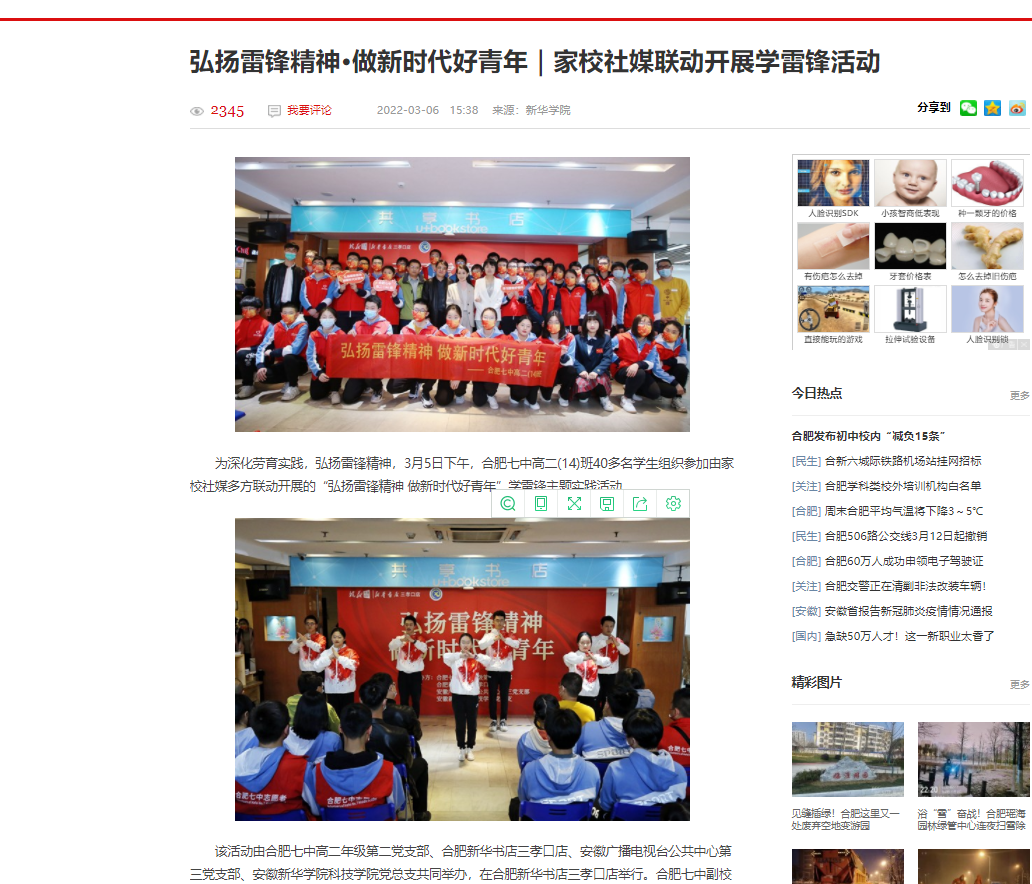 当天的实践活动受到社会各界的称赞,并被安徽卫视、安徽公共频道、市场星报、万家热线等多家省市各级媒体平台报道,反响热烈。科技学院党总支创新开展主题党日活动,融入志愿服务,以实际行动践行、弘扬新时代雷锋精神。