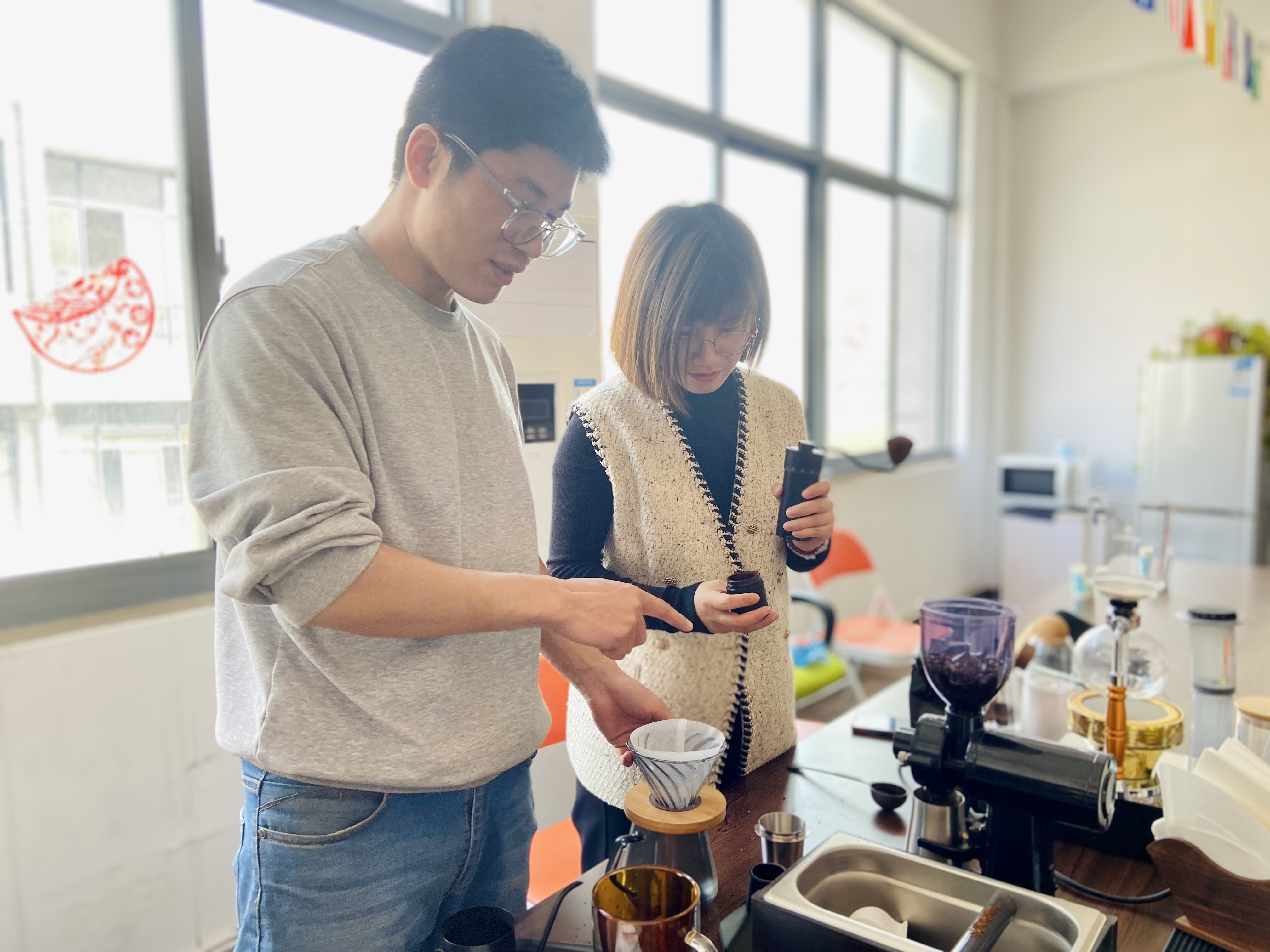 随后,走访组一行来到咖啡制作室学习咖啡文化知识及器具使用,现场体验咖啡制作并品尝不同品类的咖啡,走访活动在愉快而轻松的氛围内进行。