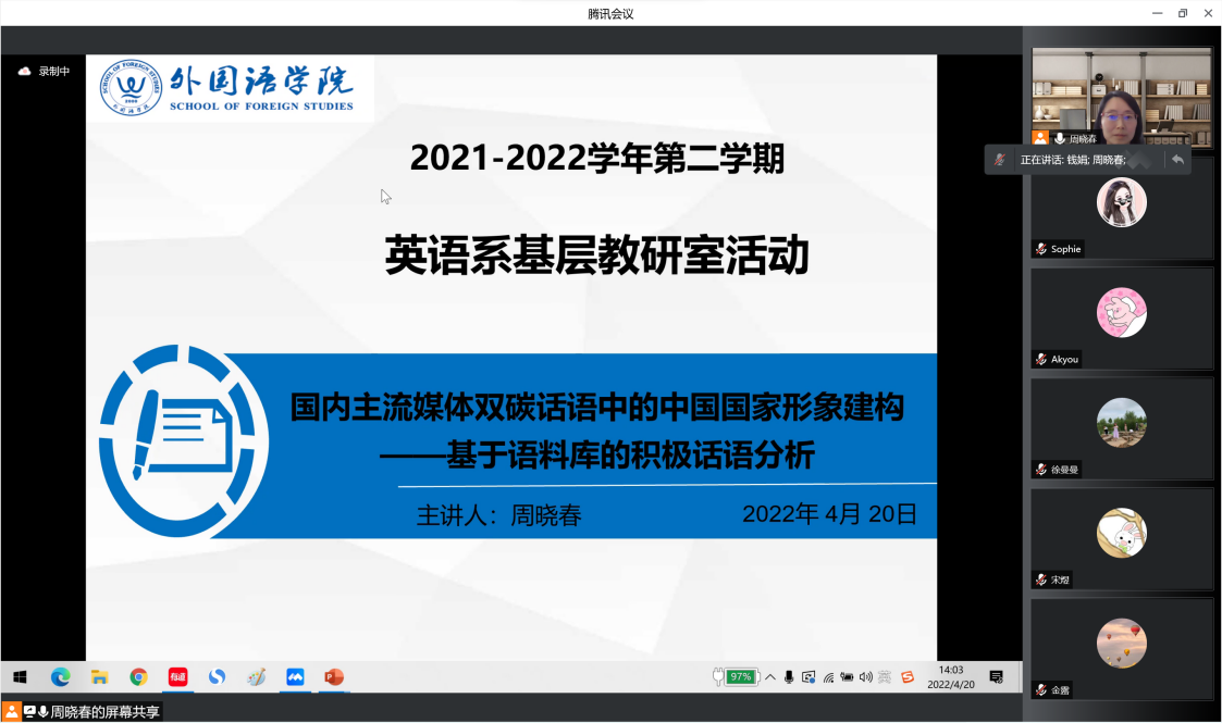 本次研讨活动的主题是“国内主流媒体双碳话语中的中国国家形象建构——基于语料库的积极话语分析”。周晓春首先介绍了“双碳”战略目标提出这一选题背景,梳理了相关研究的现状和动态,指出“双碳”语境下的中国国家形象自塑研究是目前该领域的研究空白。随后,她从拟解决的问题、语料来源、思路和方法三个方面详述了研究设计和过程。最后,周晓春从积极话语分析视角,解读了如何采用语料库技术来剖析国内主流媒体在双碳话语中所建构的“负责任、有担当”的大国形象。该研究得出的结论对新形势下中国特色双碳话语体系的建设具有重要启示。