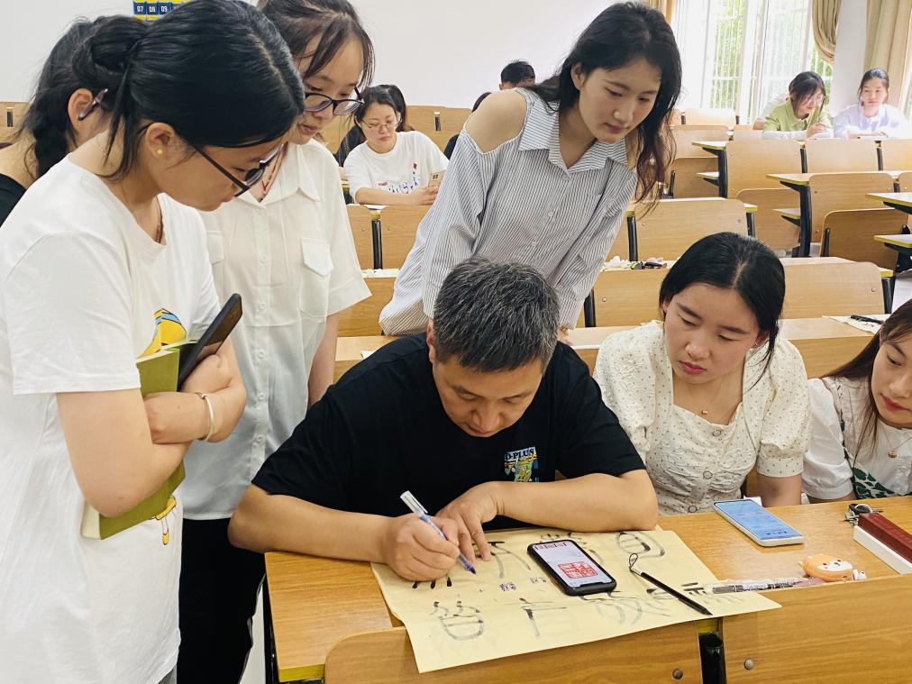 本次讲座分为理论阐述与实践指导两个环节。第一阶段,郭刚举教授系统地梳理了中国篆刻艺术的发展历程、主要流派及其艺术特征,向学生详细地介绍了篆刻艺术的文化性、功能性和审美性,深入地阐述了学习篆刻艺术的重点与若干要领。