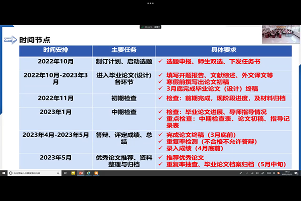 本网讯(通讯员:周东芝)为进一步提升应用型人才培养成效,提高本科毕业论文(设计)质量,10月15日,财会与金融学院召开了2023届本科毕业论文(设计)动员大会,因疫情影响,此次动员大会在线下设立主会场,线上设立分会场同步进行。财会与金融学院副院长(主持)濮明月、教学副院长张璐、教学秘书张蓉,各系主任、全体指导老师及2023届本科毕业生参加了此次会议,会议由张璐主持。