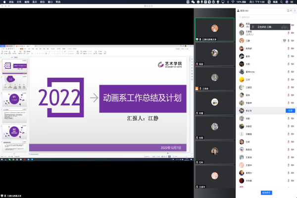 本网讯(通讯员:杨蕊)为进一步提高工作整体效能,总结交流工作经验,12月7日~9日,艺术学院召开美术系、动画系、设计系及表演系2022年度教师工作总结汇报会议。艺术学院院长江河、院长助理刘刚、各系主任及全体教师参加线上汇报会议。