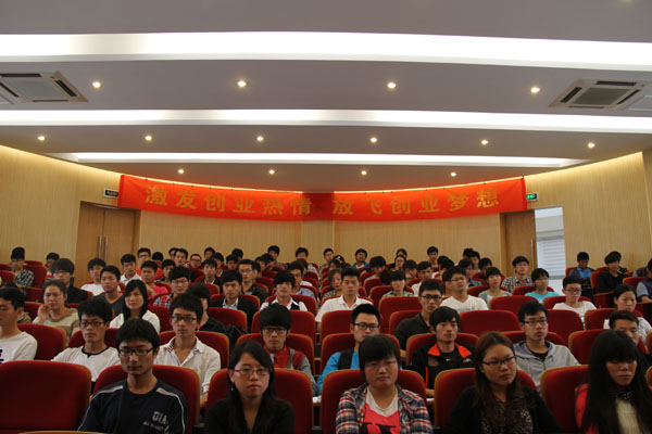 随后,杨书军作为讲座主讲与各位同学分享了自己的创业经历和感悟。他以习近平总书记在十八大上的讲话“每一个中国人都应该有一个自己的中国梦”开场,希望大家都要怀揣梦想。他用“爽”、“痛”、“专”等词语形象生动的描述了自己的创业经历和感悟。他还介绍了合团网的创办理念,经营模式和服务宗旨。他援引生活中的实例、通过诙谐易懂的演绎方式,深入浅出地告诉大家创业是艰辛的,需要坚持,需要协作。