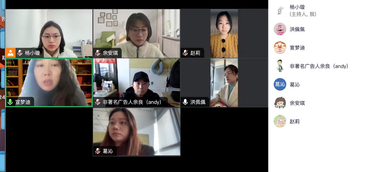 本网讯(通讯员:余安琪)为加强校企合作,携手共育新闻人才,提高教学水平和人才培养质量,近日文化与传媒学院新闻学专业线上开展了双导师工作推进会。参加本次推进会的有文化与传媒学院新闻学专业负责人宣梦迪、此次参与双导师制的校内教师杨小璇、赵莉、余安琪以及万家热线企业导师余良、洪佩佩、官倩、葛沁。