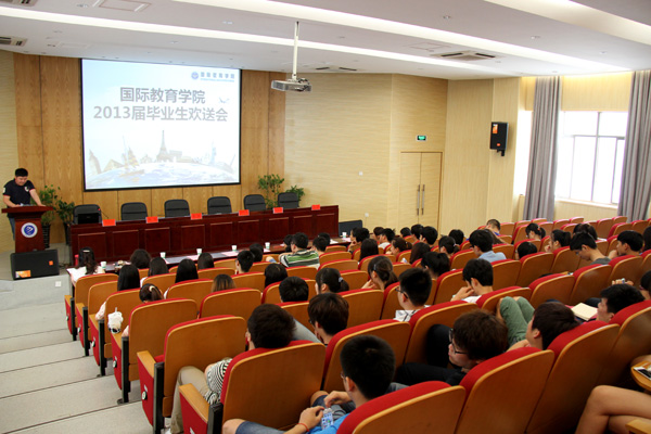 本网讯(华霄)国际教育学院2013届毕业生欢送会于6月6日在学术报告厅举办,该院院长莫瑞教授,全体教职工和学生参加了欢送会,该院副院长程宏云主持了欢送会。这是伟德官网国际教育学院为第一届完整培养的学生举办的毕业欢送会,也是伟德官网本年度第一场毕业生欢送会。