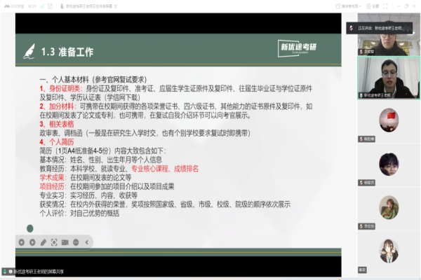 会上,王志勇老师以"复试突围与调剂策略"为主题展开系统指导。他结合最新考研政策动态,从材料准备、专业笔试、综合面试、英语考核四个模块梳理复试全流程,重点讲解了学术简历撰写、导师研究方向匹配、论文研读等备考细节。