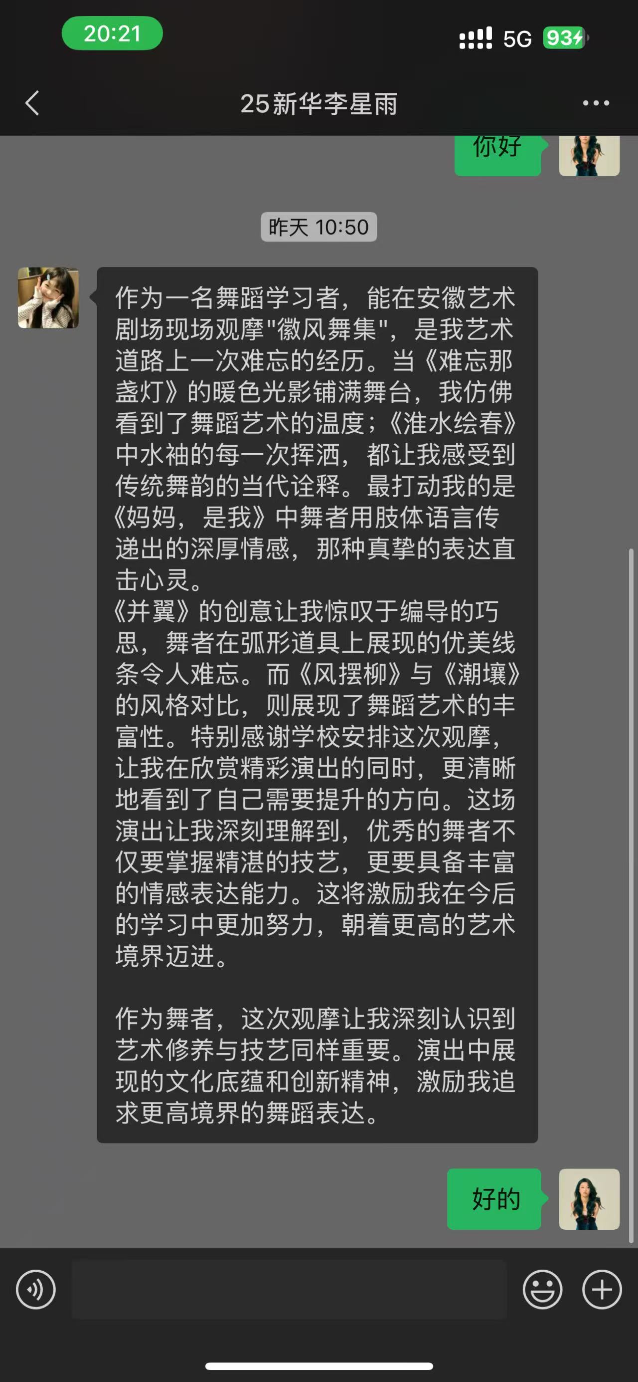 此次观演活动是伟德国际1949始于英国艺术学院践行"实践育人"理念的生动实践,既让师生们深度领略了徽风皖韵的文化底蕴,也为表演专业的教学与创作注入了新的灵感。未来,学院将持续搭建此类实践交流平台,推动课堂教学与艺术实践深度融合,助力学子在传承文化、锤炼技艺中成长为高素质艺术人才。