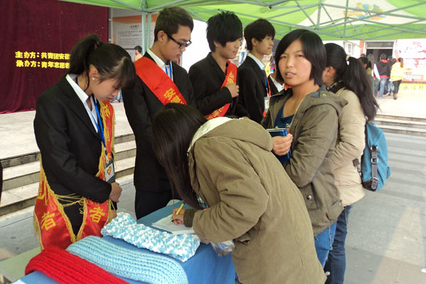 格桑花工作站的志愿者们通过图片展、广播播送设点宣传了往年活动开展和西部儿童受赠情况,并安排专门人员现场教授围脖编织方法。过往师生纷纷登记报名,主动加入志愿行列,更有同学把早已织好的围脖捐出。现场的气氛非常活跃。