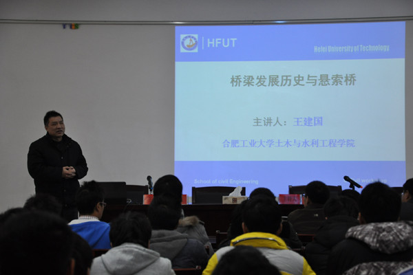 本网讯(潘争伟)12月26日下午,合肥工业大学土木与水利工程学院博士生导师王建国教授来土木与环境工程学院作题为“桥梁发展史与悬索桥”的学术报告,百余名师生参加了报告会。