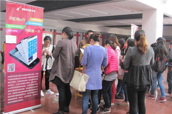 图书馆在馆舍西边设立了咨询服务台,馆长费业昆教授亲自在活动现场与专业培训师及图书馆老师一起向读者介绍移动图书馆,为每一位读者耐心讲解使用方法,并主动帮助一些同学在手机上安装客户端,图书馆青年学术社的同学也主动前来协助开展培训工作。下午2点,图书馆在二楼北门大厅又开展了相关培训及推介活动,读者在得到消息后主动前来咨询并体验,并就一些使用细节咨询了图书馆老师。今后图书馆将继续推出各种有益的活动,让图书馆的资源和服务进一步走进科研、走进教室。