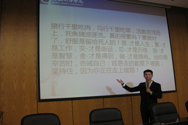 报告会上,四位同学分别结合自身经历和切身体会,从学习、生活、工作、社会实践等多个方面与在座的同学们分享了自己的奋斗历程和心得经验。两次国家奖学金获得者、伟德国际1949始于英国十佳大学生“感恩之星”候选人胡三柳同学,向同学们介绍如何在学习中,不断创新方法、提高效率,从不同的课程学习中汲取思想、奋发向上,成为名副其实的“学霸”。国家奖学金和校园才艺大赛优秀奖获得者夏宗洋同学,就自己的班级管理经验与现场的各班级代表进行了交流,他强调了班干部在班级管理中态度和计划的重要性,并提出班干部应该提高自身能力,以身作则,在班级中起带头模范作用。优秀学生干部、校园十佳大学生金婵同学结合自身两年的学生会工作经验,提出了“1+1”模式,她认为社团管理工作应该从内部和外部两个方面开展。职业生涯规划大赛银奖和大学生学科与科技竞赛一等奖获得者、校园十佳大学生李如生同学通过讲述自己在大学生活中艰苦奋斗、自主创业的故事,展现了自强不息、奋力进取,克服重重困难的精神面貌。