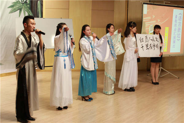 《语言表达》课程汇报演出分为风、雅、颂三个篇章。演出在2014级播音与主持艺术班的同学带来的歌曲加绕口令的混搭表演中拉开帷幕。风之声以古代精选诗歌故事为主题,同学们用扎实的语言基本功成功地体现了他们基础发声、语言表达等多方面的能力;其中,《水调歌头》将语言艺术和吟唱艺术精妙结合,再加上古典美丽的舞台呈现,使整个节目古典唯美、富有诗意。雅之韵以现代散文故事为主题,同学们不仅充分展示了播音学子娴熟的语言技巧,也通过动情的演绎感染了现场的气氛,可谓精彩纷呈,赢得场下观众经久不息的掌声。在颂之美中,播音主持班辅导员洪玉老师以其精湛的专业能力为大家演绎了《青衣》;《语言表达》课程徐翔老师的《康熙王朝》将经典帝王形象完美地演绎在舞台上,最后的贯口更是引爆了全场。