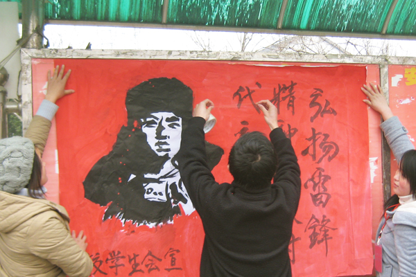 记者在采访过程中看到,每个人手里都拿着工具刮除墙壁上、电线杆上、宣传栏上张贴的小广告。在中快广场的宣传栏上,小广告被清理后已经贴上了学习雷锋的宣传画。在翰林广场信息工程学院2010级学生还拉开横幅举办学雷锋签名活动。