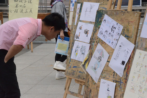 此次活动共收到来自各班级的百余幅作品,经评委老师审核,挑出近40件作品展出,作品多以大学生活为创作背景,以人们常见的心理现象为创作基础,运用图文并茂的形式,从不同角度展现当代大学生的心理状况,诠释心理健康知识的重要意义,形成了积极健康的精神导向。此次心理漫画展将心理健康工作与动漫学院学科专业特色有机结合,内容丰富多彩,形式新颖,内涵丰富。既反映出健康向上、格调积极的正能量,又以动漫的方式幽默地表达,避免了生硬的说教,让观众们耳目一新,喜闻乐见,吸引了众多师生驻足观看。