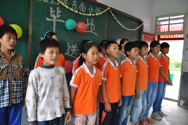 实践队员们首先来到的是位于双涧镇东南边的魏圩村东南小学,全校师生120余人,该校教师队伍老龄化严重,且缺乏音乐、美术、体育、英语等各科教师。队员们到达的那天,恰逢东南小学举行毕业典礼,为了配合学校工作,实践队员们经过一天的紧张培训和彩排,为全校师生送上了一场别开生面的的毕业欢送会。欢送会既有小朋友们的诗朗诵《再见,我的母校》,也有实践队员们的合唱《光荣啊!中国共青团》等。精彩的表演赢得了现场师生的热烈掌声。欢送会结束后,实践队员们还走访了魏圩村的部分留守儿童及贫困学生家庭,向他们赠送了学习和生活用品。