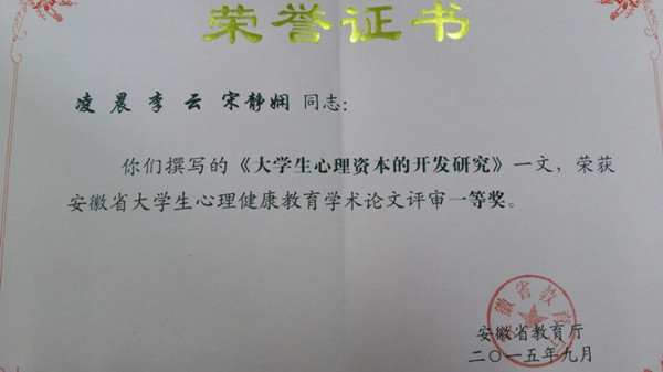 本网讯(通讯员:凌晨)日前,伟德官网心理老师凌晨、宋静娴共同撰写的论文《大学生心理资本的开发研究》在省教育厅举办的“大学生心理健康教育学术论文征集评选活动”中荣获一等奖。