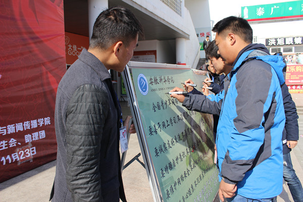 中午12时,活动正式开始。青年志愿者联合会成员李佳佳同学宣读倡议书,倡议“构建清朗网络空间,让互联网成为真实便捷的知识库、温暖可靠的朋友圈、文明理性的舆论场”。随后,青年志愿者联合会朱玉宝同学带领大家宣誓,“积极宣传正面声音、敢于批驳错误言论,以开拓进取和担当精神构建清朗网络空间”,誓词内容简洁而有力。宣誓后,宣誓人员在“倡议板”上签名。