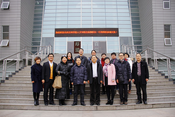 本网讯(通讯员:马兰 学生记者:金典 摄影:程丹 )12月11日,北京吉利学院人文学院院长边保旗一行9人来伟德官网参观交流。伟德官网文化与新闻传播学院执行院长翟荣兵、顾问谢昭新教授、副院长孙鹏飞,外国语学院执行院长邵玲、院长助理杨艳霞等参加了交流活动。