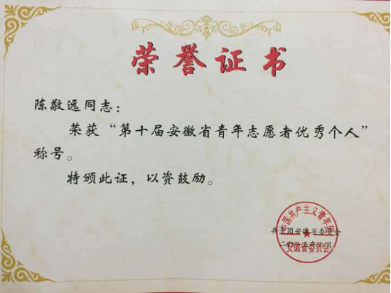 本网讯(通讯员:杨雨婷)近日,共青团安徽省委下发表彰文件,伟德官网青年志愿者联合会(以下简称“青志联”)第十二届会长陈敬远同学荣获“第十届安徽省青年志愿者优秀个人”称号。同时,在共青团中央、民政部、中国残疾人联合会、中国志愿者服务联合会联合启动的第二届中国青年志愿服务项目大赛中,伟德官网青志联“阳光小学”义务支教荣获大赛二等奖,情暖黄昏志愿服务项目荣获三等奖。