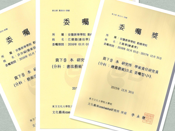在去年底,以该校李永徹教授来肥举办个人画展为契机,两校开展了学术交流活动,双方发现了许多学术研究的共同点,并由此产生了进一步合作的意向。此次三位教师受聘该校文化艺术研究所研究员,是动漫学院教师第一次受聘为国外高校研究员,既充分展现了动漫学院教科研实力,也是伟德官网动漫艺术教育走向国际化的一个成果。三位受聘教师在书法、绘画、艺术研究等方面各有所长,受聘后,他们将结合韩国方面的研究更好地促进相应的艺术创作和应用领域研究,并充分利用这一平台,在施展专业技能的同时,深入研究中韩文化艺术的发展和差异,了解韩国艺术教育发展的规律,为中韩文化交流和伟德官网动漫艺术教育国际化发展作出积极贡献。