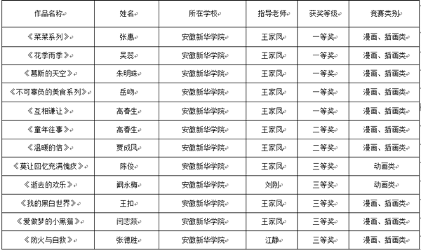 “中国大学生原创动漫大赛”由教育部高教司指导,教育部高校动画、数字媒体专业教学指导委员会主办,2015年首次举办,计划将每年一届,主要针对全国高校动画、数字媒体相关专业学生征集作品,旨在发掘优秀动漫人才和作品、提升学生创新创业能力,全面提高高校动画、数字媒体相关专业教学水平和人才培养质量。安徽赛区比赛由安徽省教育厅主办、安徽工程大学承办,大赛分为本科和专科两个组,设动画类作品、漫画/插画类作品、新媒体动漫类作品等类别,共收到省内19所本科院校917件作品、23所专科院校349件作品,经过19位专家的评审,共选出本科组特等奖作品1件、一等奖作品89件、二等奖作品139件、三等奖作品242件。
