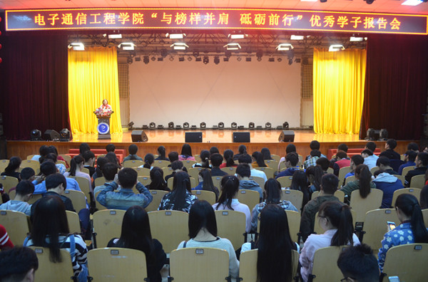 电子通信工程学院副院长钱颜娇在报告会的致辞中强调,开展报告会的目的在于营造优良的学风,“以身边的故事感动人,以典型事迹教育人,以优秀人物激励人”,通过优秀学子代表们执着的精神、不懈的努力和积极的实践来引领广大在校生走出属于自己的精彩人生路。