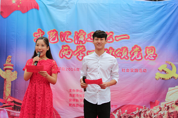 实践队以反映社会主义核心价值观为主要内容,以弘扬时代精神,倡导文明新风为目标,深刻贯彻践行“两学一做”的重要精神,精心安排了两场文艺汇演。一篇《大地行吟——合肥篇》的朗诵表达了对合肥的歌颂和赞美,同时也吸引了观众的目光。现场共表演了14个节目,其中民族舞《印度新娘》、笛子演奏《美丽的神话》、黄梅戏《女驸马》《夫妻双双把家还》以及拉丁舞等节目最受村民们的欢迎,现场一段《小苹果》的舞蹈更将本次汇演推向了高潮,现场100多名观众掌声不断,喝彩连连。本次汇演不仅丰富了广大村民的业余文化生活,更展现了伟德官网社会实践队的特色与亮点,同时也践行了“两学一做”中文艺下乡的重要精神。