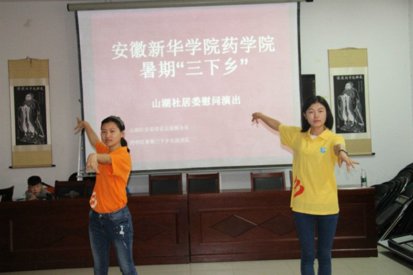 慰问演出结束后,实践队员利用专业所学,对山湖社区的老人进行简单的健康体检,如测量血压、健康知识普及等。
