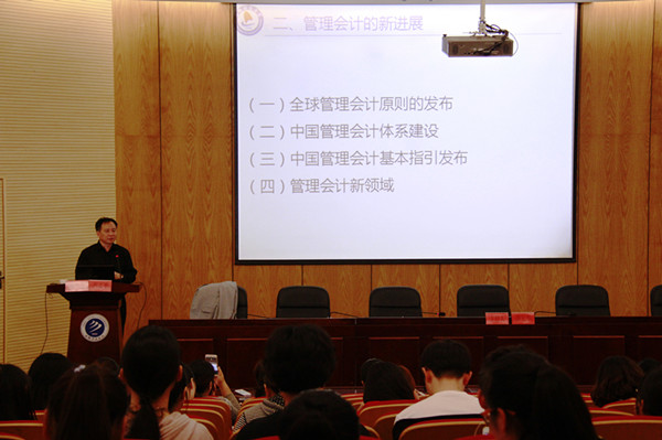 卢太平围绕当前管理会计的新进展和管理会计的发展趋势两个方面进行报告。他首先就管理会计的概念、职能、作用以及与财务会计的区别等方面进行详细介绍,并结合全球管理会计原则(Global Management Accounting Principles)进行实例说明。他表示,自改革开放以来,我国会计工作紧紧围绕服务经济财政工作大局,会计改革与发展取得显著成绩,有力地支持了经济社会的蓬勃发展,但我国的会计标准建设,考虑外部投资者、社会公众和外部审计较多,而服务内部管理决策不够,因此管理会计发展相对滞后;财政部发布的《关于全面推进管理会计体系建设的指导意见》,就致力于让中国管理会计的发展达到质的飞跃。最后,卢太平与在场师生进行了交流。