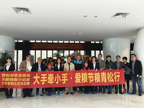 本次活动通过“大手牵小手”的形式,“七彩向日葵”的志愿者与《合肥晚报》小记者们结成对子,共同开展纪念仪式、参观青松研学游基地、观看爱粮节粮教育电影、品尝青松豆芽宴等活动。安徽省粮食局政策法规处处长谢玉兴,合肥市粮食局党组成员、副局长汤和平也来到现场,与 “大小手”们共同宣传爱粮节粮。