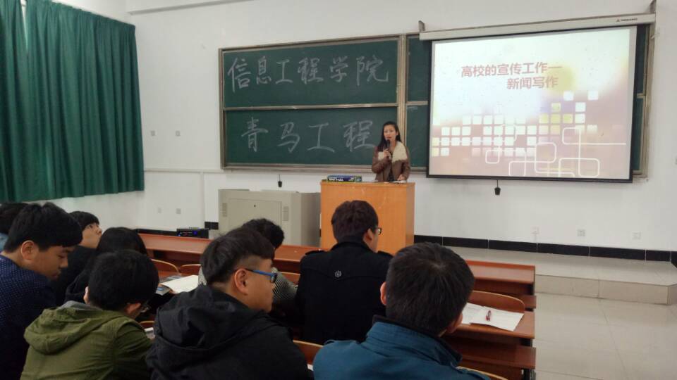 信息工程学院行政秘书王婷为学生干部讲授了新闻写作课程。以新闻报道的基本构架为切入点,向同学们介绍了新闻命题要领、新闻写作基本要领、新闻写作的特点和原则。课程中,她还结合实例,为大家讲述了新闻摄影的照片拍摄要领。