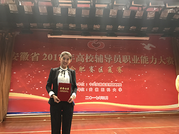 本网讯(通讯员:王强亚)为推动高校辅导员队伍专业化、职业化发展,促进辅导员交流学习,进一步提高辅导员工作能力和育人水平,3月11日至13日,由省委教育工委主办,安徽医科大学承办的“2017年安徽省高校辅导员职业能力比赛复赛(合肥赛区)”顺利举办,伟德官网辅导员董甜甜获得三等奖的好成绩。