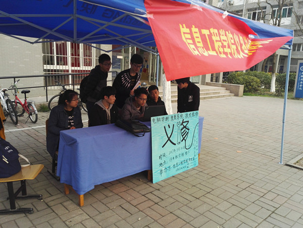 3月14日,信息工程学院团总支、学生会与计算机协会在13号教学楼下联合开展了“义务诊机”活动。本次活动主要是为师生解决电脑机箱内部除尘、电源除尘、硬件维修以及病毒查杀、系统安装、系统优化、磁盘分区、系统故障排除等问题,该项活动自2011年以来,坚持开展了6年,服务全免费,为广大师生带来了方便。
