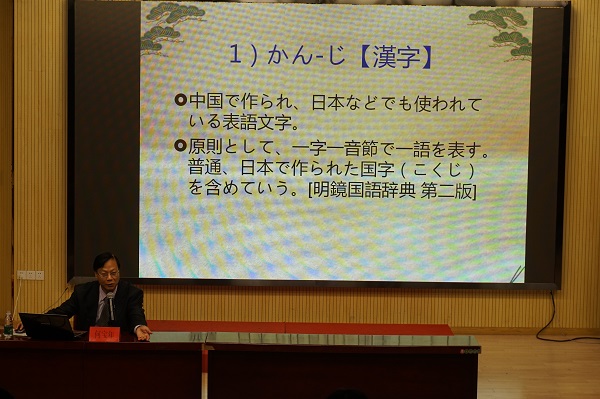 报告会上,何宝年首先结合自身研究成果,图文并茂、深入浅出地阐述了日语词汇的分类、汉语词汇音读与训读的产生。其次,他针对学习日语汉字及汉语词汇的难易问题,给予学生们一些方法与建议。最后,他重点阐明“习得”的含义,即语言的学习不仅是学,还要掌握及应用。他鼓励学生学语言、做学问要勤思好问,勤查辞典多思考,从细微之处去感受语言魅力、体验文化差异。