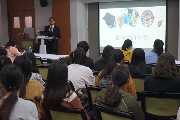 金哲首先提出现今大多数学生在“学”与“思”的概念及关系上存在很多疑惑,这将会成为学生学习生活及步入社会生活的屏障。其次,他导入“学”与“思”的概念,指出“学”不只是学习书本知识,而是包括社会各方面各领域文化知识;“学”不只是工具,它是创造生命价值的目的及存在方式。“思”是沉思、考虑,“思考”就是去伪存真,去粗取精的过程。“思”的结果就是自我境界的提升。最后,金哲结合自己留学生涯总结“学”与“思”是相辅相成的对应关系,“思”源于“学”,又高于“学”,是“学”的提升,是与时俱进的开拓创新,是对传统的推陈出新,更是人性魅力及价值的体现。