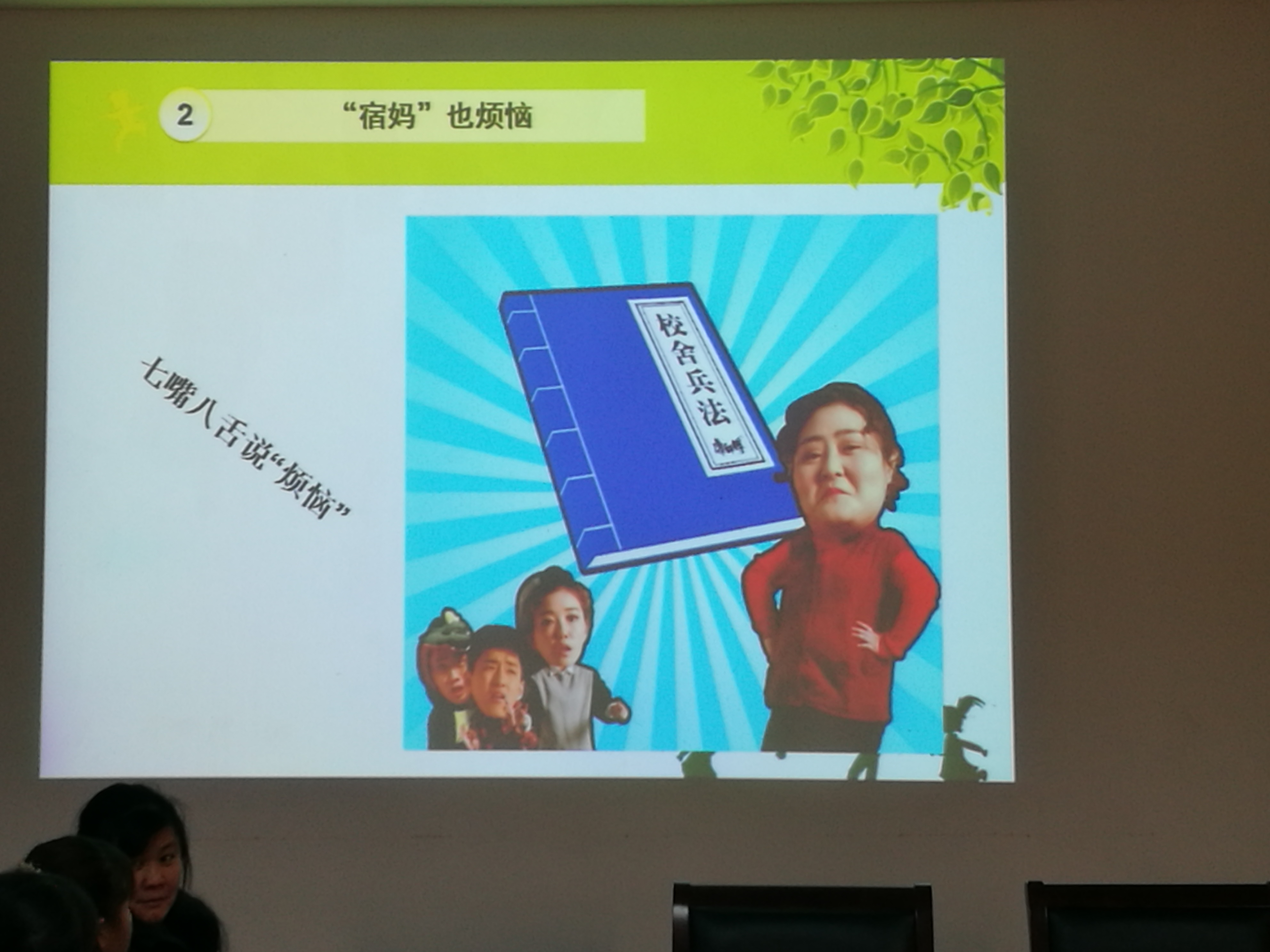 本期“宿妈课堂”特别邀请心理健康教育中心教师凌晨作题为“宿妈欢乐颂”的宿管心理调适讲座,讲座主要分为 “宿妈在身边” “宿妈也烦恼” “宿妈欢乐颂”“宿妈问问看”四个环节,以精彩纷呈的图片和幽默诙谐的语言,展现了宿管员与同学们在日常点滴中积攒起来的深情厚谊,直面了宿管员在日常工作中经常遇到的问题与烦恼,分析了宿管员在烦躁、苦恼时如何有效的调节自己的情绪,重新以更好地状态投入工作。