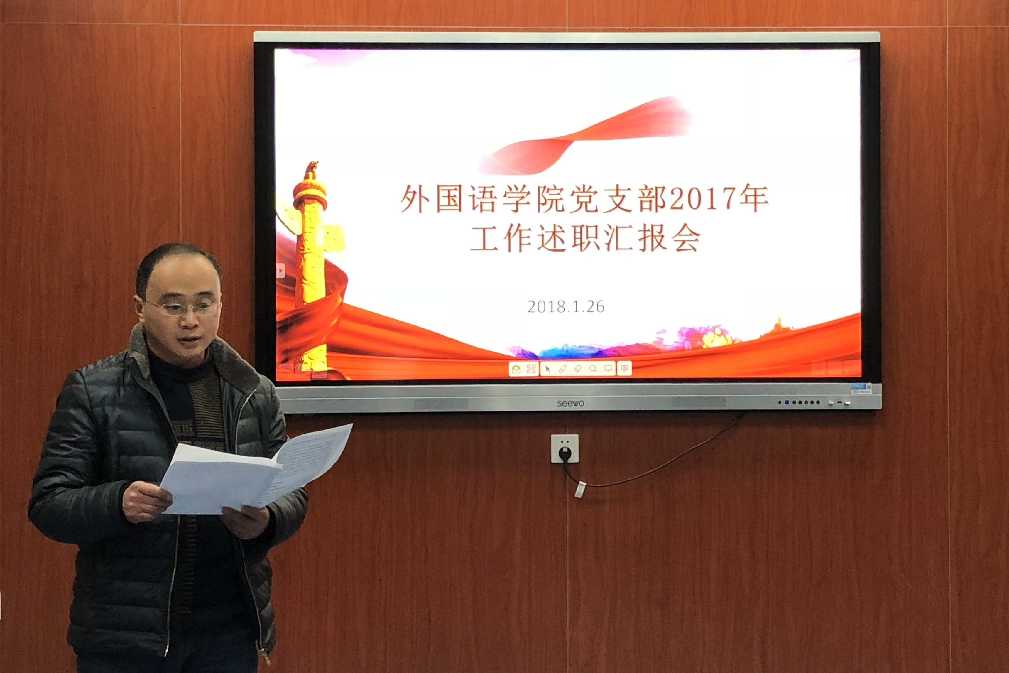 本网讯(通讯员:郝亮)为深入贯彻落实党的十九大会议精神,进一步加强基层党组织建设,交流各支部工作经验,1月26日,外国语学院党总支召开2017年度支部书记党建工作述职汇报会。外国语学院党总支成员及各支部书记参会,会议由党总支副书记周景主持。