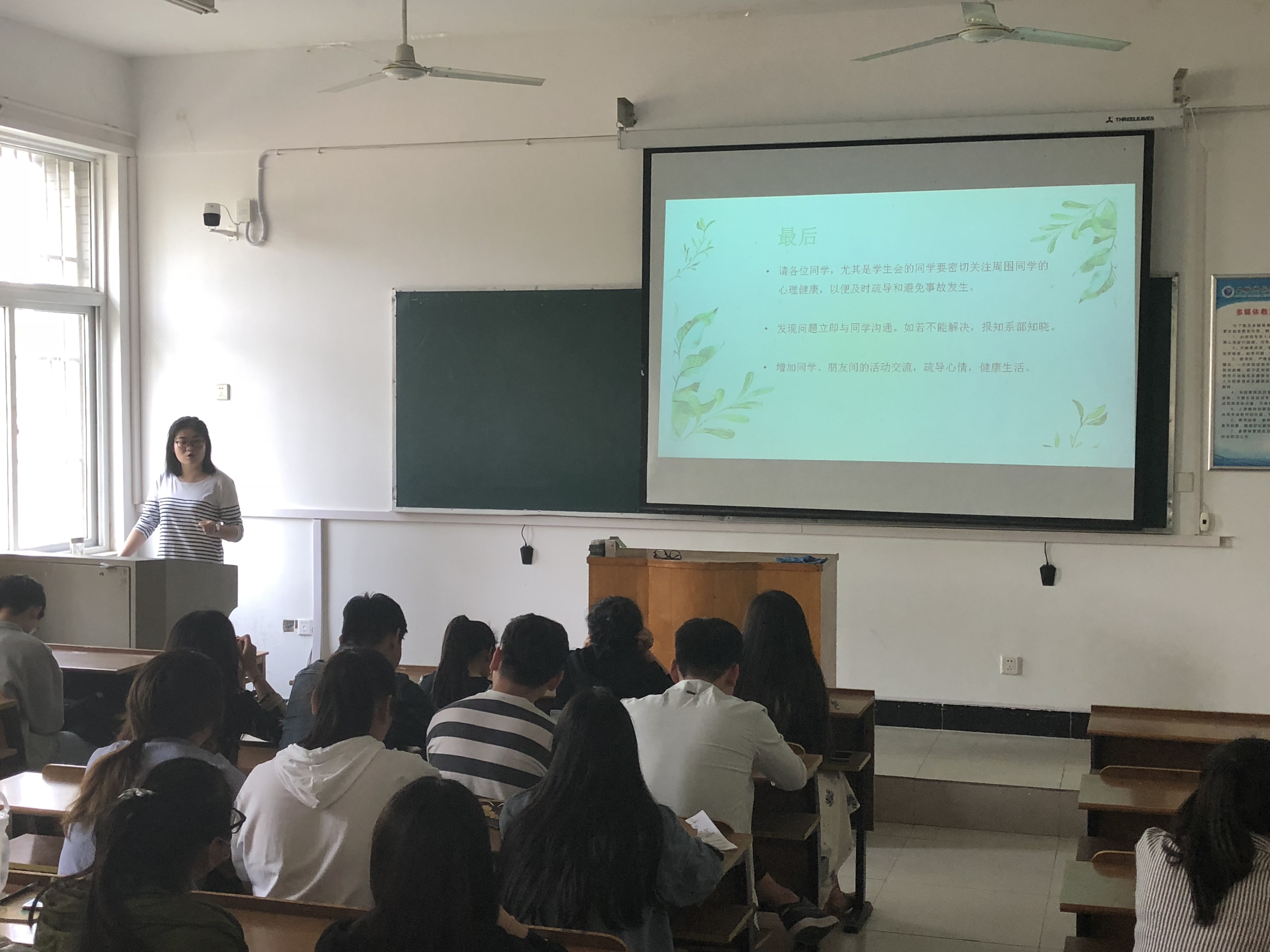 心理培训师许雅群此次给学生们培训的主题围绕春季常见心理问题以及预防解决方法。她指出,心理问题产生的原因和换季有关,春季是心理问题与疾病的高发季节,发病前兆主要表现在睡眠障碍和情绪障碍。而易患的心理问题与疾病主要有躯体不适,焦虑症,抑郁症,慢性疲劳综合症,精神分裂症等。随后,她针对不同的心理问题给出了相应的解决方法,一是要正视自身情绪变化,主动接纳负面情绪,山有起伏,水有波澜,人的情绪也处于微妙的变化中,树立对自身情绪的正确认知后,将过度的情绪宣泄出去,保持心态平和;二是娱乐消遣法、朋友帮扶法、运动消气法、一笑了之法等都可以有效宣泄负面情绪。