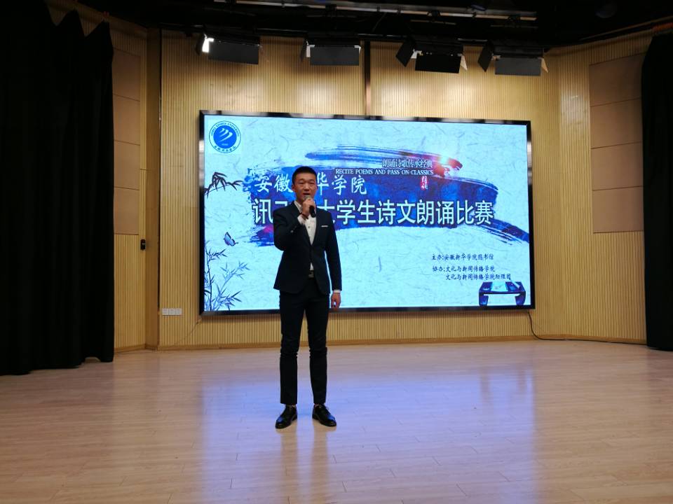 本网讯(通讯员:彭洪磊、杨超)为进一步丰富校园文化生活,营造浓厚的书香校园氛围,借以传承国学文化经典,弘扬民族文化精髓,激发学生的读书和诵读热情。4月17日下午,由伟德官网图书馆、文化与新闻传播学院主办的第十三届讯飞杯大学生诗文朗诵比赛新华学院决赛在新闻演播厅举办。担任本次比赛的评委有图书馆馆长汤干君,文化与新闻传播学院院长翟荣兵、院长助理洪玉,教师郑帅、余红仙、王盼盼,特邀来宾安徽广播影视职业技术学院李志强老师。