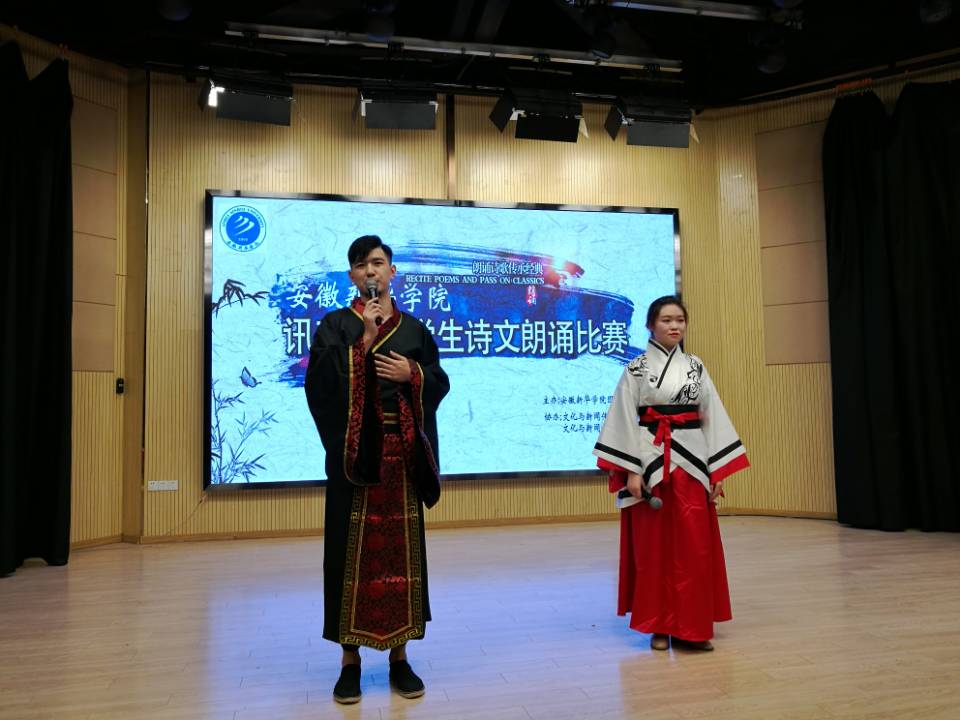 比赛分为专业组和非专业组两组。现场气氛热烈,学生们热情高涨。专业组学生李悦、蒋轶群、朱纬、胡江东朗诵的《可爱的中国》以出彩的民国服装造型和热情洋溢的语言表达获得了观众们的一致点赞。非专业组的《钗头凤》在学生郭圆、王琴深情演绎下扣人心弦,引人入胜。从各二级学院遴选出来的优秀选手们纷纷盛装亮相、同场竞技。他们字正腔圆,高声朗诵;他们激情昂扬,意气风发;他们可爱活泼,创意无限,为现场观众奉上了一场视觉和听觉的盛宴。现场掌声此起彼伏。